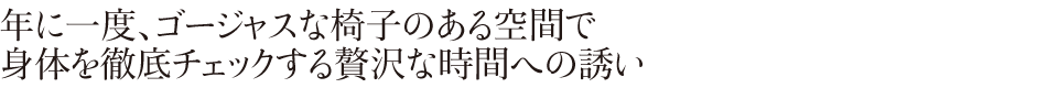 人間ドックも、雲の上にいる心地の椅子に座って極上空間で安らげば、優雅なひと時に変わります。 文=山岸みすず text by Misuzu Yamagishi 写真=堀裕二 photograph by Yuji Hori |